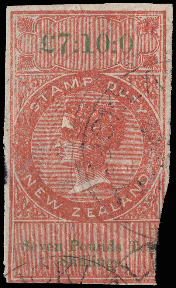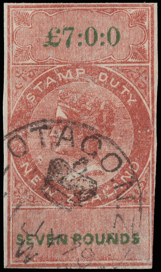 624 S R240-S image1867, Queen Victoria, die I, imperf, £7:7:6, deep blue & black, overprinted "SPECIMEN" (Kiwi R240-S), deep, rich color and full margins, Very Fine. Kiwi price for the issued stamp is NZ$1,250 used. (Image)