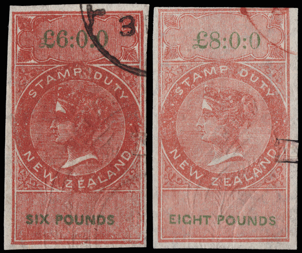628 O R251a, R253a, R255a image1867, Queen Victoria, die I, imperf, £6, £7 & £8, Star watermark (Kiwi R251a, R253a, R255a), unusually fresh with light handstamped cancels, the £8 also with a dual slit cancel; generally nice margins, the £7 a bit close, Fine to Very Fine.