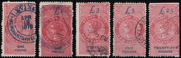 641 O R353//R363 image1871-75, Queen Victoria, die II, perf'd, £1//£25, Six different (Kiwi R353//R363), £1 (2, one with long tail on "£"), £2/10s, £3 (long tail), £5 & £25 (long tail), all with handstamped cancels, £1 also pen and £5 also dual slit; £25 clipped perfs on two sides, otherwise Fine to Very Fine.