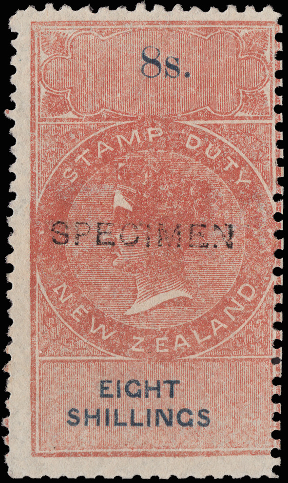 632 S R302-S image1871-75, Queen Victoria, die I, perf'd, 8s orange & blue, overprinted "Specimen" (Kiwi R302-S), o.g., lightly hinged, Fine to Very Fine. (Image)