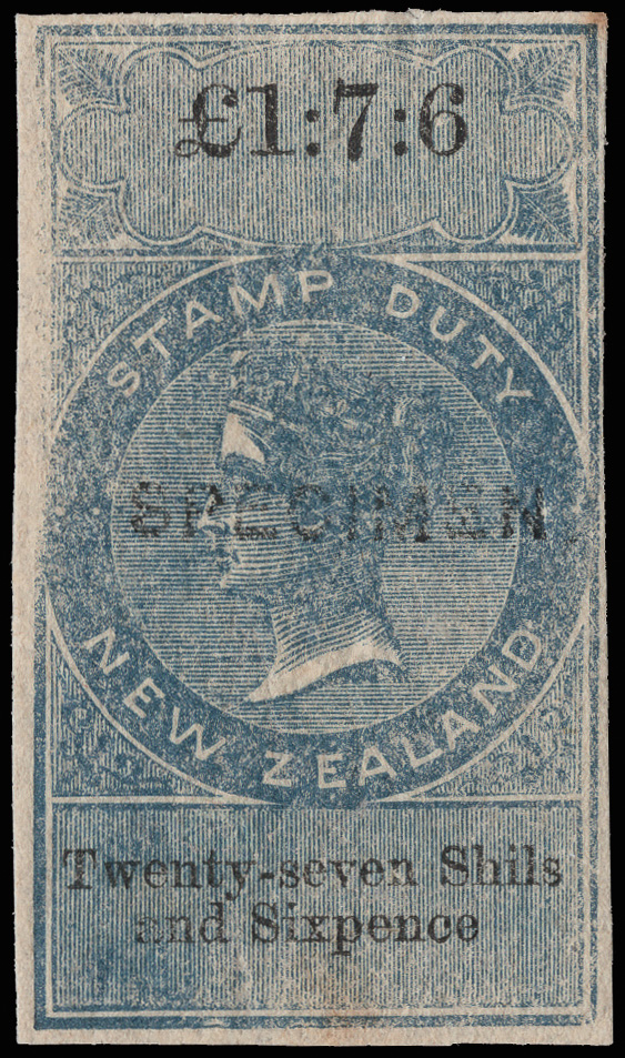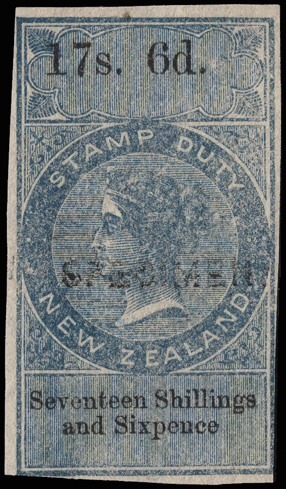 623 S R236-S image1867, Queen Victoria, die I, imperf, 17s6d deep blue & black, overprinted "SPECIMEN" (Kiwi R236-S), exceptionally fresh with decent margins, Fine to Very Fine. Kiwi price for the issued stamp is NZ$1,250 used. (Image)