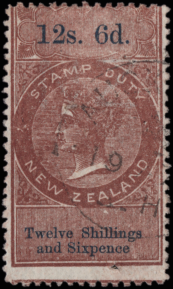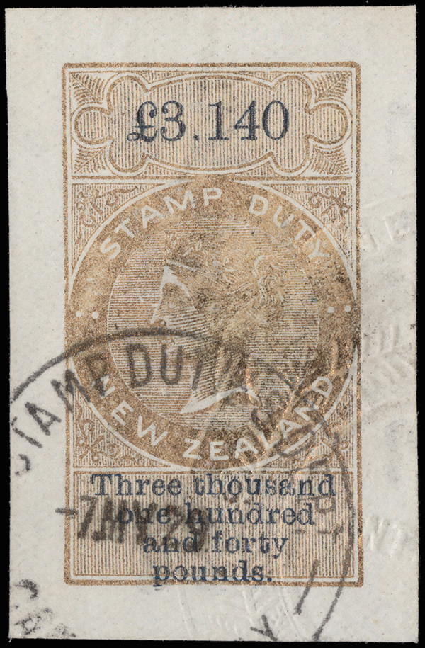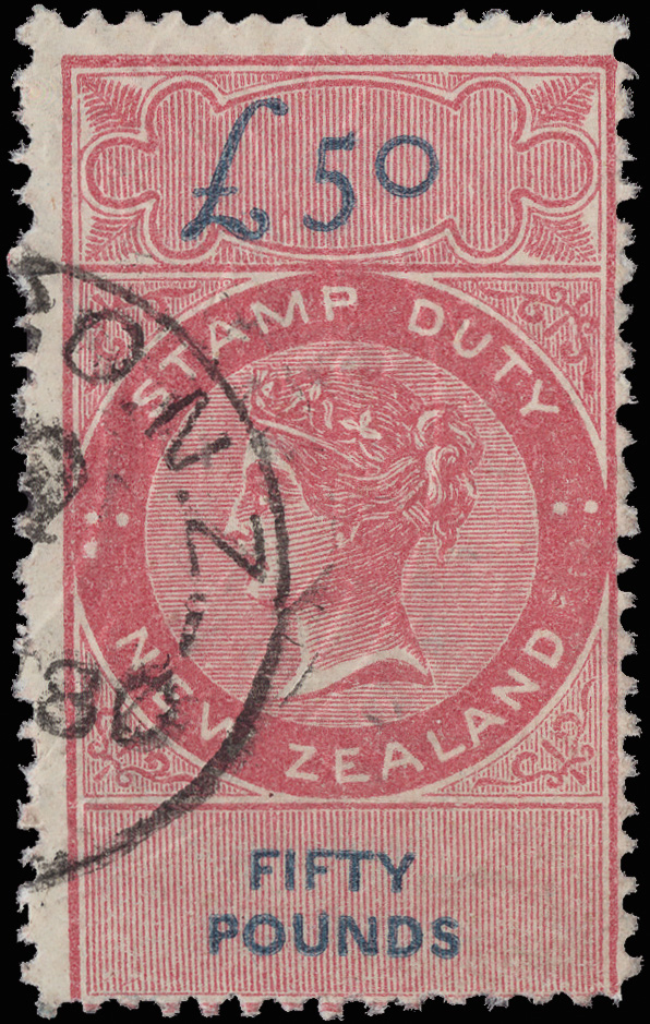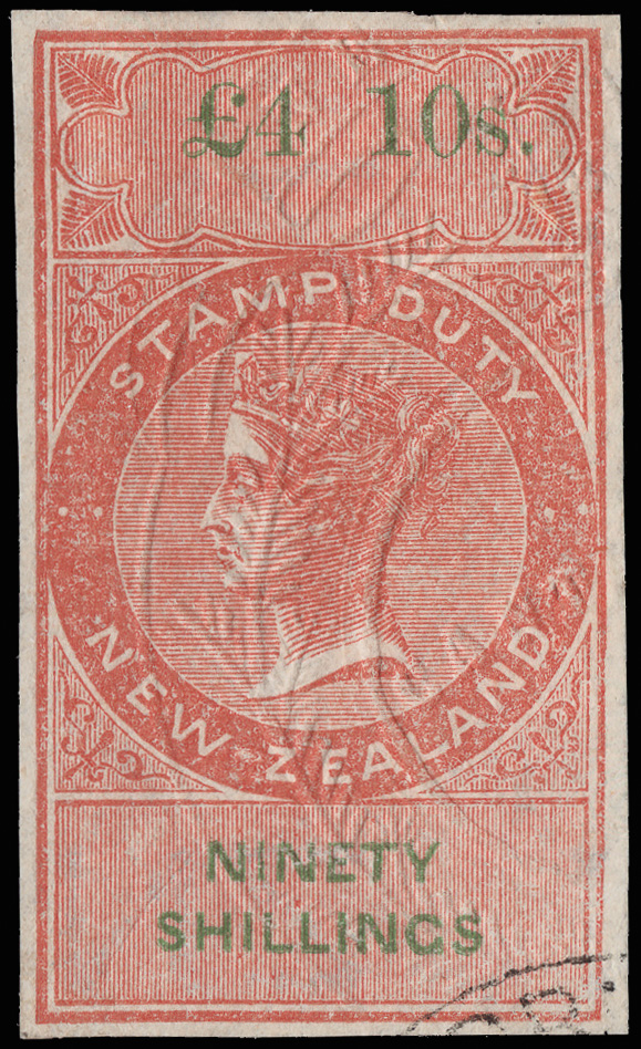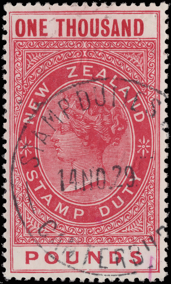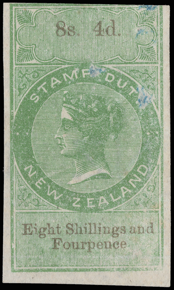 649 O R442 image1884, Queen Victoria, die II, Ultra High Value, imperf, £2,616 gold & blue (Kiwi R442), lovely unpunched example with full, 4mm "boardwalk" margins; lightly embossed with a nearly complete c.d.s., "Stamp Duties Dept., Can(terbury), 7.MY.29", Extremely Fine.