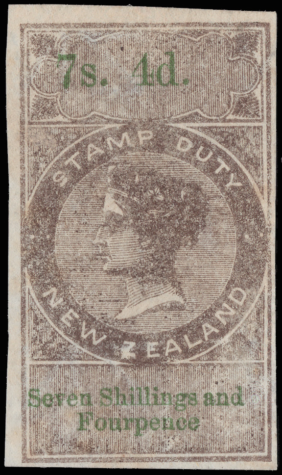 621 O R221 image1867, Queen Victoria, die I, imperf, 7s4ds gray brown & green (Kiwi R221), uncanceled and exceptionally fresh (appears unused) with ample to large margins, Very Fine.