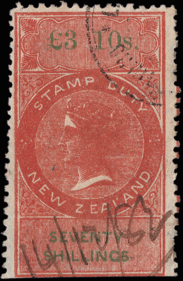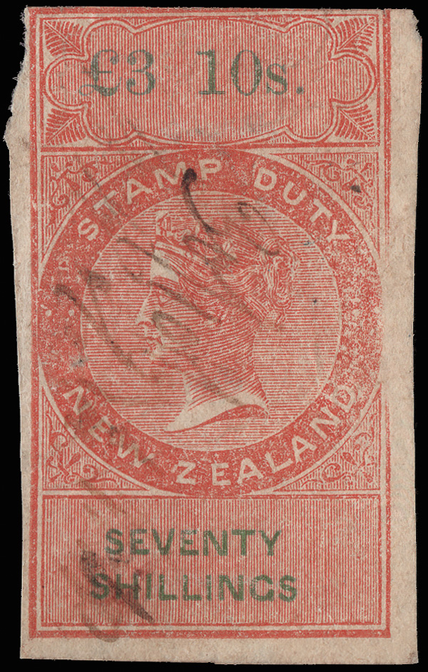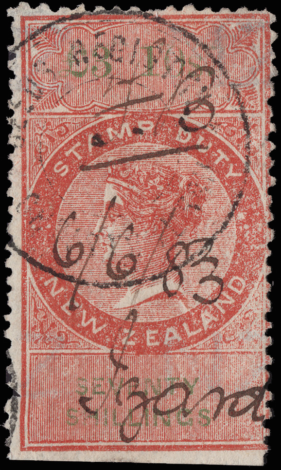 636 O R324 image1867, Queen Victoria, die I, £3:10s orange red & green (Kiwi R324), handstamped & pen cancels, "6/6/83"; bottom perfs clipped, Fine to Very Fine.