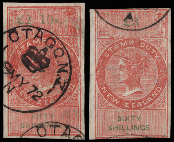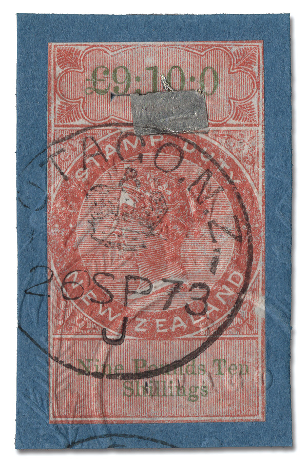 631 Z R258a image1867, Queen Victoria, die I, imperf, £9:10s orange red & green (Kiwi R258a), tied on a small piece of a blue document by a neat "Otago, N.Z. (crown), 26 SP 73, J" c.d.s., close all around but most attractive with an intact foil punch, Fine to Very Fine.