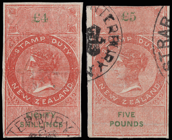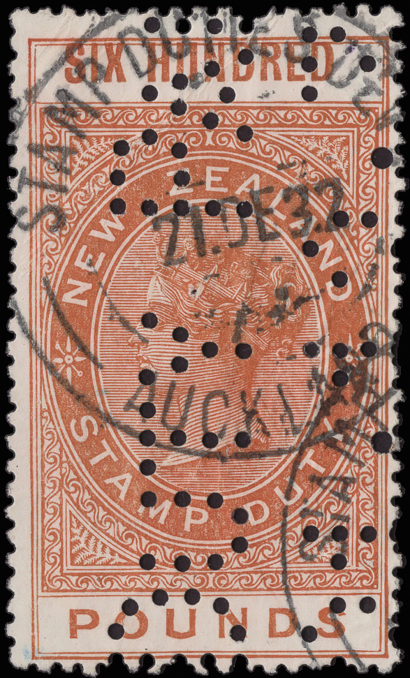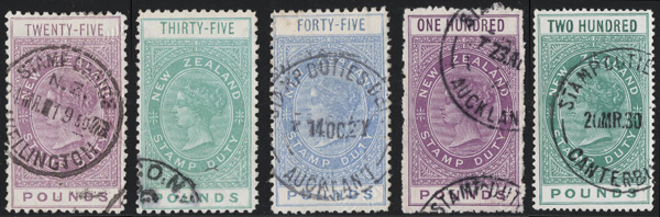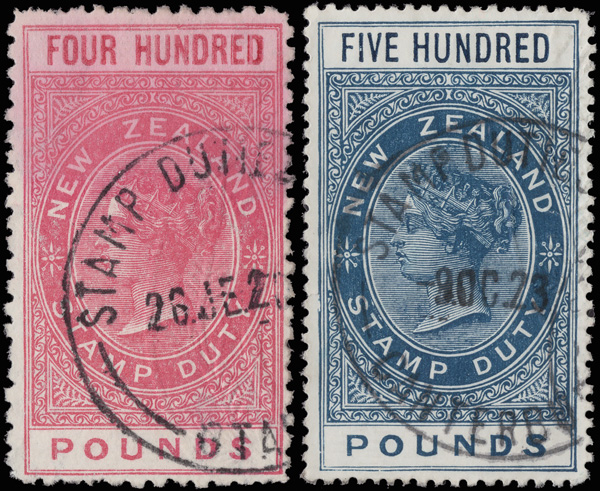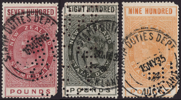 651 O R502I-R505I image1913, Queen Victoria, perf 14½x14, £600-£900 (Kiwi R502I-R505I), handstamped & punched cancels, all but the £600 with a single rounded corner, otherwise Fine to Very Fine.