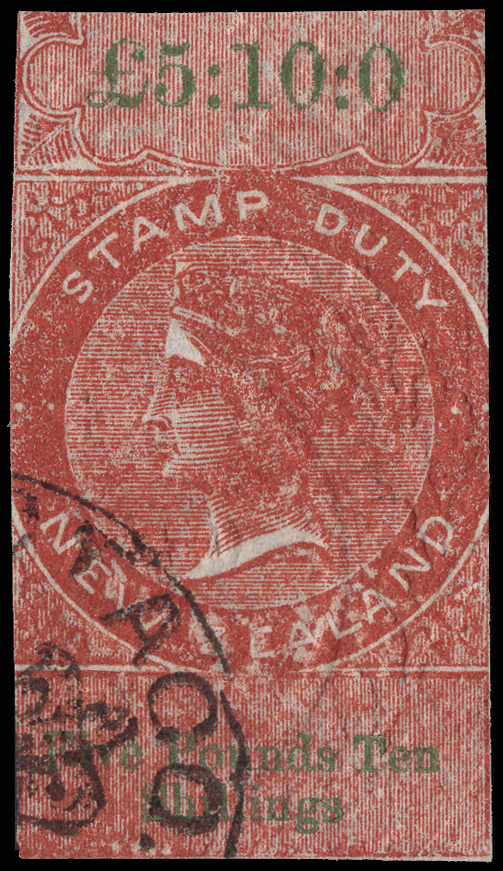 627 O R250a image1867, Queen Victoria, die I, imperf, £5:10s orange red & green (Kiwi R250a), fresh and neatly canceled with a partial Otago c.d.s.; but just touching or slightly cut in all around.