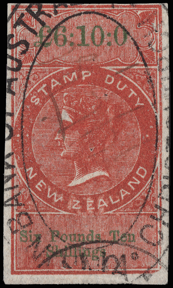 629 O R252a image1867, Queen Victoria, die I, imperf, £6:10s orange red & green (Kiwi R252a), fresh and neatly canceled by a "Union Bank of Australia, Christchurch" double oval and a faint pen; clear to mostly large margins, nearly Very Fine. A beauty.