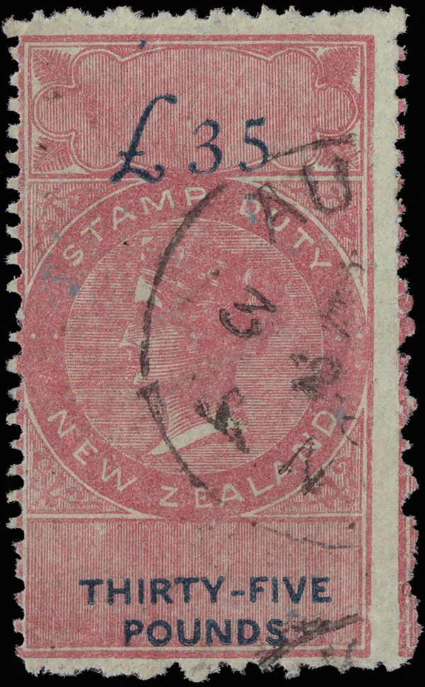639 O R332 image1867, Queen Victoria, die I, perf'd, £35 deep rose & blue (Kiwi R332), fresh color light partial Auckland c.d.s.; faint natural paper wrinkle, Fine to Very Fine.