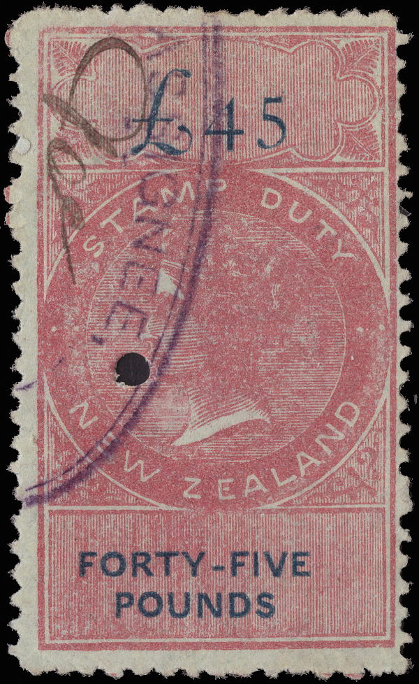 640 O R334 image1867, Queen Victoria, die I, perf'd, £45 deep rose & blue (Kiwi R334), oval handstamp, manuscript signature and single small hole puncj; blind perfs and small nick at the left, Fine to Very Fine.