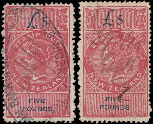 644 O R360, R360a image1867, Queen Victoria, die II, perf'd, £5 rose & blue (Kiwi R360, R360a), normal and long tail "£", pen canceled; normal "£" also with a "National Bank of Wellingtom" oval; each with a faint horizontal crease, otherwise Very Fine.