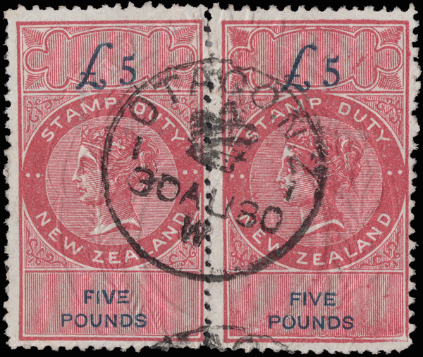 643 O R360 image1867, Queen Victoria, die II, perf'd, £5 rose & blue (Kiwi R360), a gorgeous horizontal pair, canceled with a neat "Otago, N.Z. (crown), 30 AU 80, W" c.d.s., Very Fine.