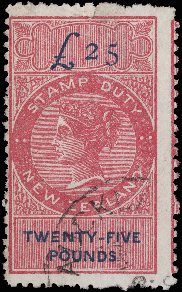 645 O R363 image1867, Queen Victoria, die II, perf'd, £25 rose & blue (Kiwi R363), light Auckland corner cancel; tiny tear at the top, otherwise Fine to Very Fine.
