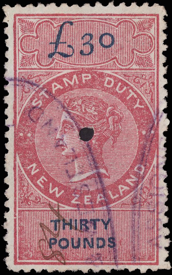646 O R364 image1867, Queen Victoria, die II, perf'd, £30 rose & blue (Kiwi R364), canceled double oval, small manuscript and single small punch, fresh and exceptionally well centered, otherwise Fine to Very Fine.