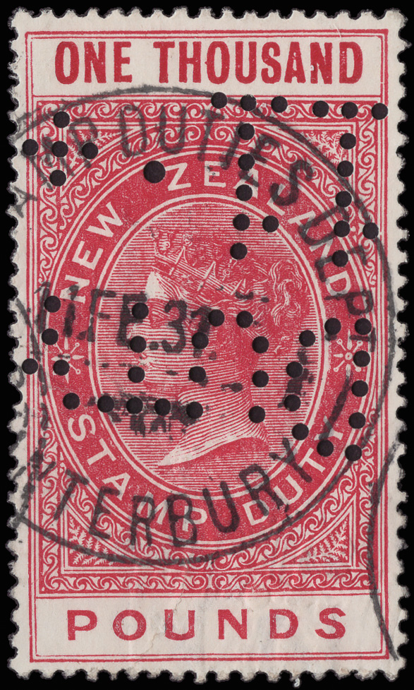 652 O R506I image1913, Queen Victoria, perf 14½x14, £1,000 rose (Kiwi R506I), two outstanding examples, one punched, the other handstamped, Very Fine to Extremely Fine.
