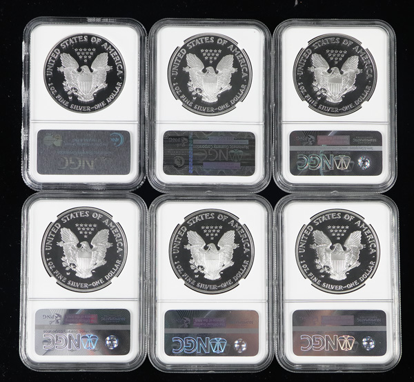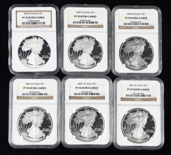 Group of (6) $1 Silver Eagles NGC PR70 Ultra Cameo, 2001-2006, includes: 2001-W NGC graded PF70 Ultra Cameo, 2002-W NGC