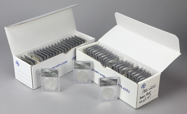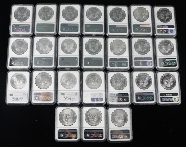 $1 Silver Eagle ASE Brown Label Set (24) ANACS Graded MS69, 1986-2009, complete from 1986-2009; all graded MS69; features 24