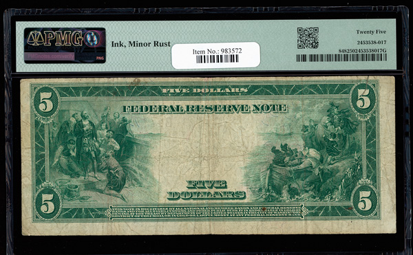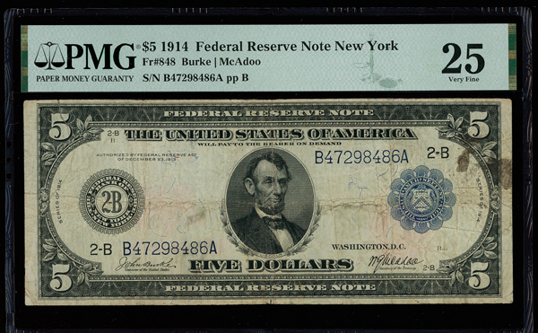 Fr. 848 1914 $5 Federal Reserve Note New York PMG 25 Very Fine (Fr-848), PMG graded Very Fine 25. (Image) (Image2)