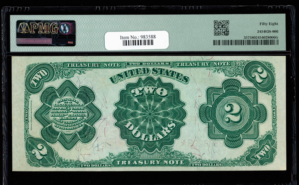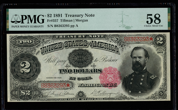 Fr. 357 1891 $2 Coin Note Treasury Note PMG 58 Choice About Unc (Fr-357), PMG graded Choice About Uncirculated 58. (Image) (Image2)
