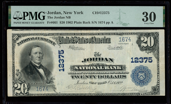 Fr. 661 1902 $20 Plain Back National Bank Note Jordan, New York CH# 12375 PMG 30 Very Fine (Fr-661), PMG graded Very Fine