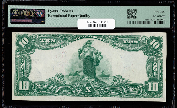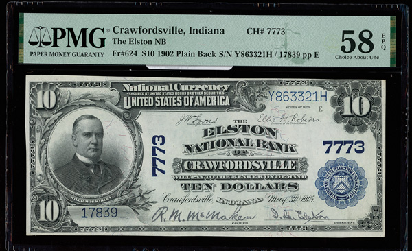 Fr. 624 1902 $10 Plain Back National Bank Note Crawfordsville, Indiana CH# 7773 PMG 58 Choice About Unc EPQ (Fr-624), PMG