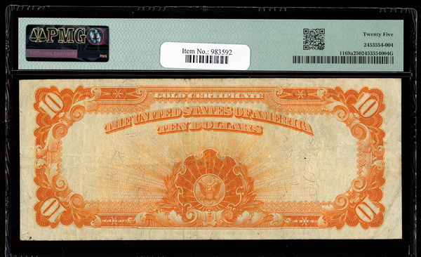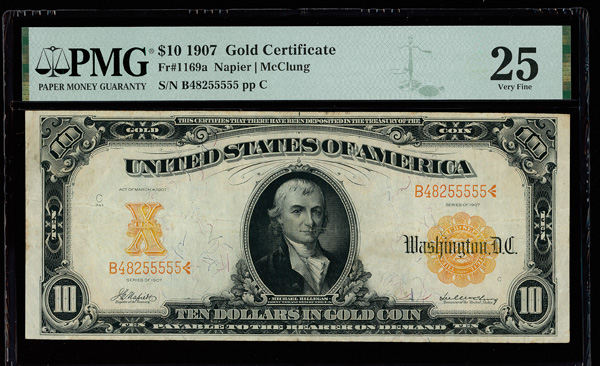 Fr. 1169a 1907 $10 Gold Certificate PMG 25 Very Fine (Fr-1169a), PMG graded Very Fine 25. (Image) (Image2)
