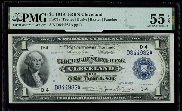 Fr. 718 1918 $1 Federal Reserve Bank Note Cleveland PMG 55 About Uncirculated EPQ (Fr-718), PMG graded About Uncirculated