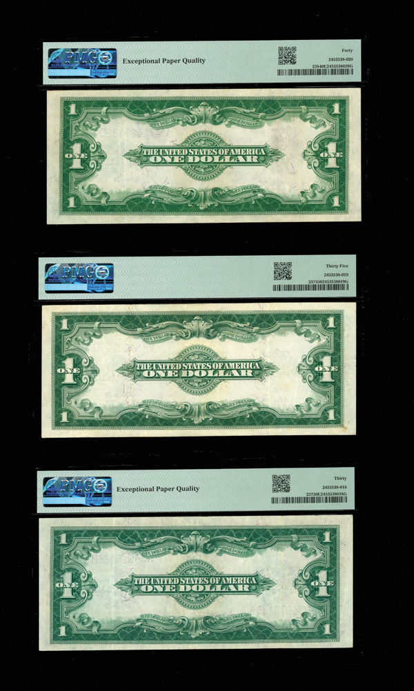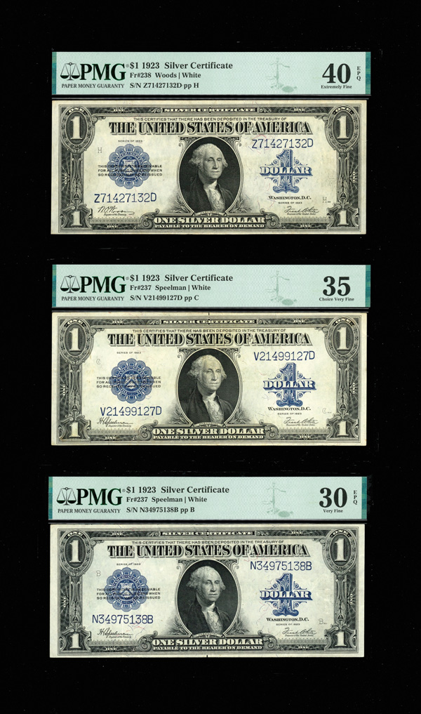 Group of (3) 1923 $1 Silver Certficates PMG Graded, group includes: Fr. 237 PMG 30 VF EPQ; Fr. 237 PMG 35 Choice VF; Fr. 238