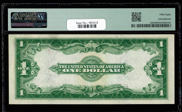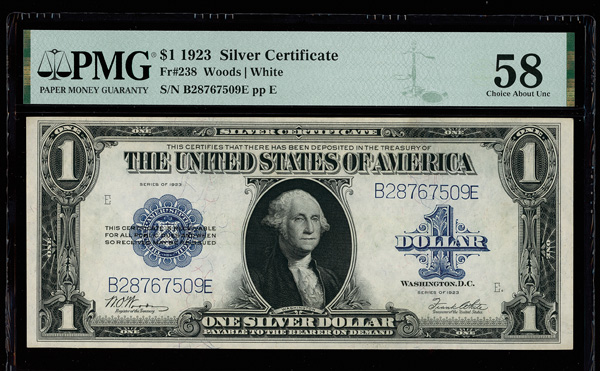 Fr. 238 1923 $1 Silver Certificate PMG 58 Choice About Unc (Fr-238), PMG graded Choice About Uncirculated 58. KL-53. (Image) (Image2)
