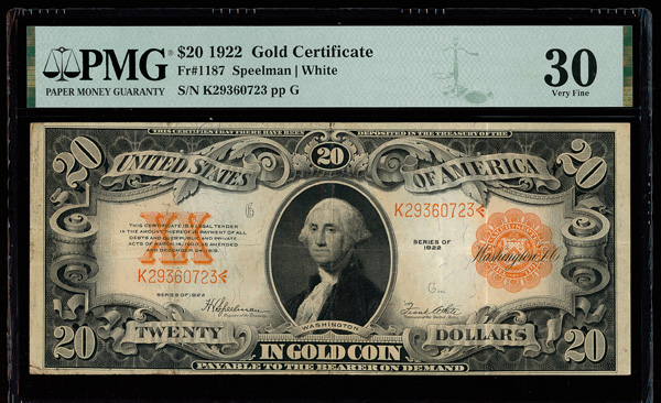 Fr. 1187 1922 $20 Gold Certificate PMG 30 Very Fine (Fr-1187), PMG graded Very Fine 30. (Image) (Image2)