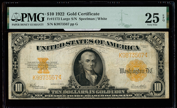 Fr. 1173 1922 $10 Gold Certificate PMG 25 Very Fine EPQ (Fr-1173), PMG graded Very Fine 25. (Image) (Image2)
