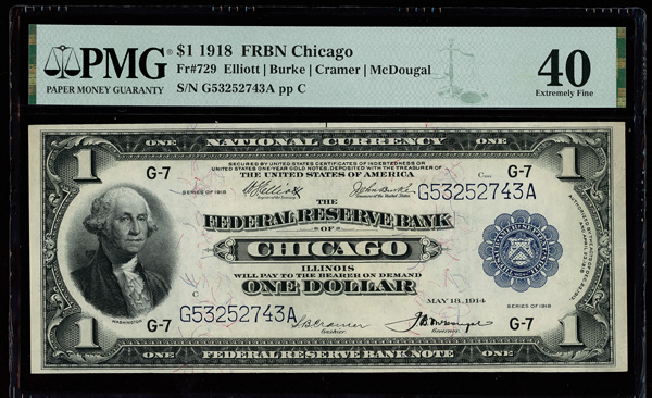 Fr. 729 1918 $1 Federal Reserve Bank Note Chicago PMG 40 Extremely Fine (Fr-729), PMG graded Extremely Fine 40. (Image) (Image2)