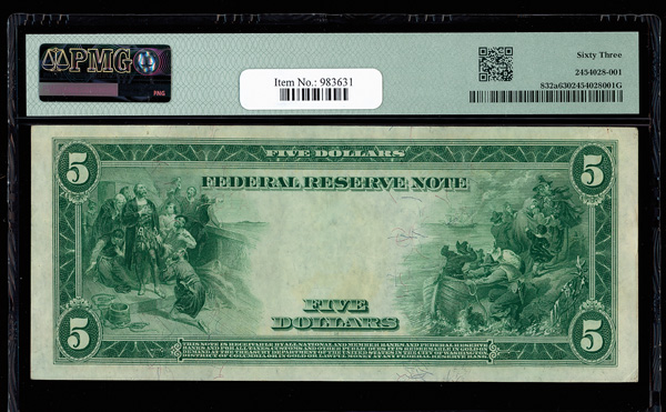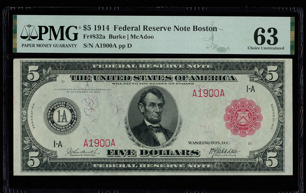 Fr. 832a 1914 $5 Federal Reserve Note Boston PMG 63 Choice Uncirculated (Fr-832a), PMG graded Choice Uncirculated 63. (Image) (Image2)