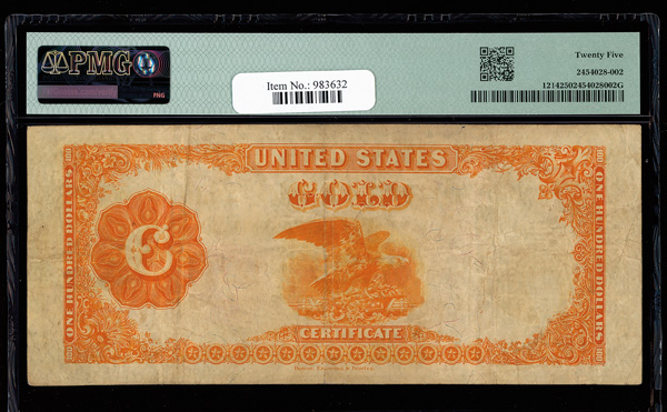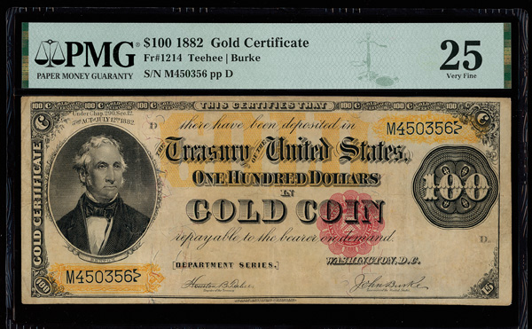 Fr. 1214 1882 $100 Gold Certificate PMG 25 Very Fine (Fr-1214), PMG graded Very Fine 25. (Image) (Image2)