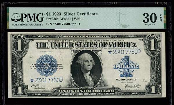 Fr. 238* 1923 Silver Certificate PMG 30 Very Fine EPQ (Fr-238*), PMG graded Very Fine 30. (Image) (Image2)