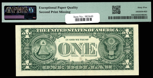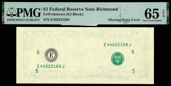 Fr. Unknown $1 Federal Reserve Note MISSING PRINT ERROR PMG 65 Gem Uncirculated EPQ, Second Print Missing, PMG graded Gem