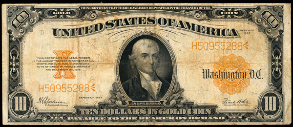 Fr. 1173 1922 $10 Gold Certificate, in Fine to Choice Fine condition; please inspect. (Image) (Image2)