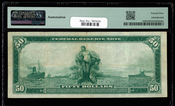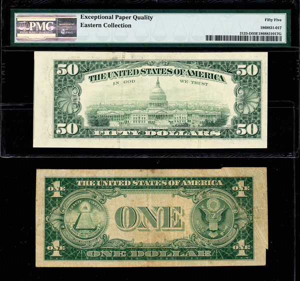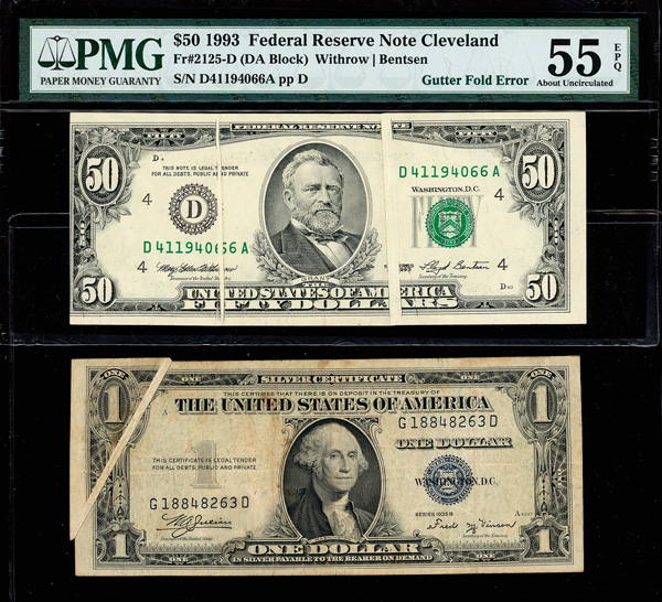 Pair of Gutter Fold Error Notes, 1935//1993, features one $50 1993 Federal Reserve Note (Cleveland) graded by PMG as 55