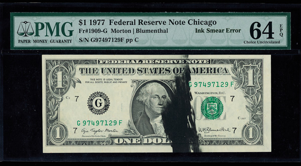 Fr. 1909-G 1977 $1 Federal Reserve Note Chicago Ink Smear Error PMG 64 Choice Uncirculated EPQ (Fr-1909-G), PMG graded