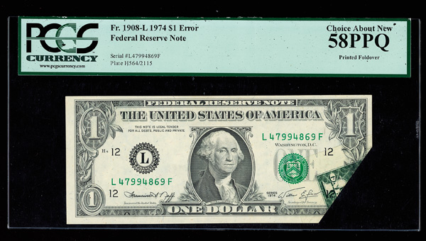 Fr. 1908-L 1974 $1 Federal Reserve Note Corner Fold Error PCGS 58 Choice About New PPQ (Fr-1908-L), PCGS graded Choice About