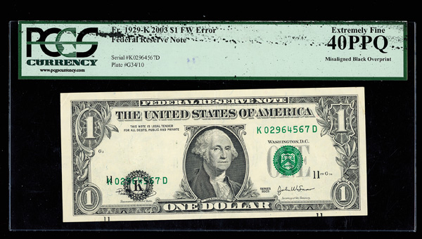 Fr. 1929-K 2003 $1 Federal Reserve Note Shifted Seal Error PCGS 40 Extremely Fine PPQ (Fr-1929-K), PCGS graded Extremely