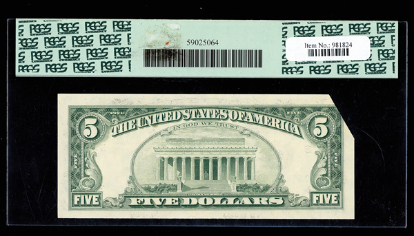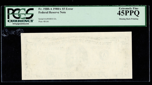 Fr. 1980-A 1988A $5 Federal Reserve Note Missing Back Printing Error PCGS 45 Extremely Fine PPQ (Fr-1980-A), PCGS graded
