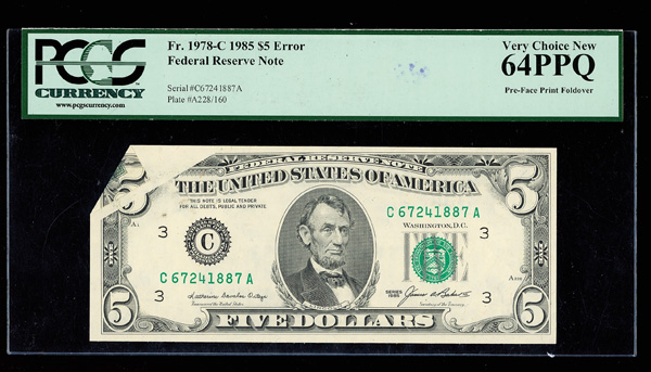 Fr. 1978-C 1985 $5 Federal Reserve Note Pre-Face Print Foldover Error PCGS 64 Very Choice New PPQ (Fr-1978-C), PCGS graded