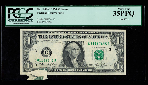 Fr. 1908-C 1974 $1 Federal Reserve Note Printed Tear Error PCGS 35 Very Fine PPQ (Fr-1908-C), PCGS graded Choice Very Fine