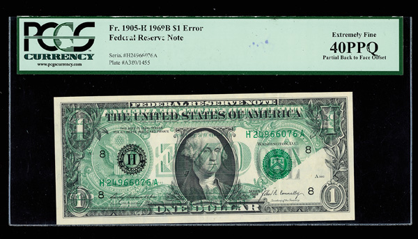 Fr. 1905-H 1969B $1 Federal Reserve Note Partial Back to Face Offset Error PCGS 40 Extremely Fine PPQ (Fr-1905-H), PCGS