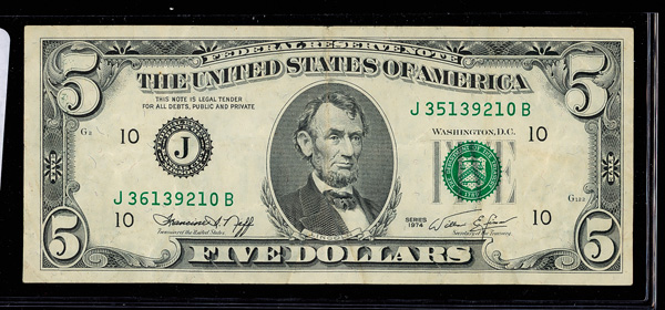 Fr. 1973-K 1974 $5 Federal Reserve Note Mismatched Serial Numbers Error (Fr-1973-K), in fine condition with notable fold in
