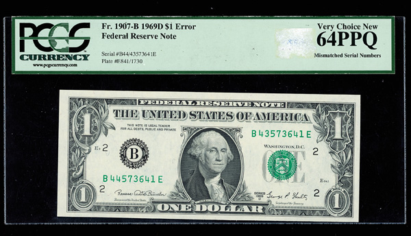 Fr. 1907-B 1969D $1 Federal Reserve Note Mismatched Serial Number Error PCGS 64 Extremely Fine PPQ (Fr-1907-B), PCGS graded