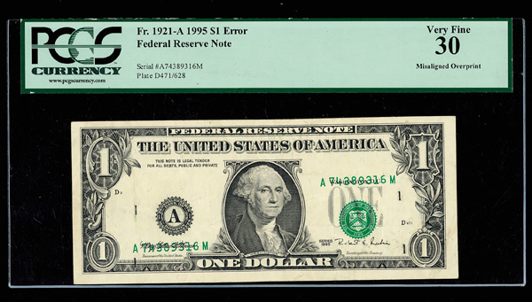 Fr. 1921-A 1995 $1 Federal Reserve Note Misaligned Overprint Error PCGS 30 Very Fine (Fr-1921-A), PCGS graded Very Fine