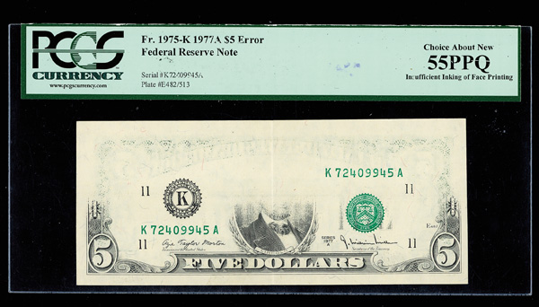 Fr. 1975-K 1977A $5 Federal Reserve Note Insufficient Inking of Face Printing Error PCGS 55 Choice About New PPQ