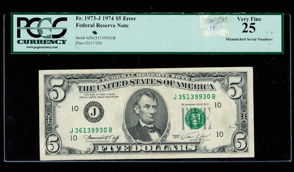 Fr. 1973-J 1974 $5 Federal Reserve Note Mismatched Serial Numbers Error PCGS 25 Very Fine (Fr-1973-J), PCGS graded Very Fine